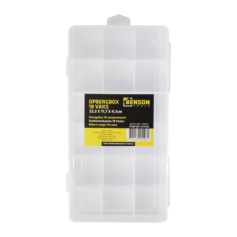 Diese kompakte Aufbewahrungsbox mit 18 Fächern ist eine ideale Lösung, um kleine Teile, Zubehör und Befestigungsmaterial übersichtlich aufzubewahren. Dank der klaren Fachaufteilung bleibt alles ordentlich getrennt und gut sichtbar, sodass Sie schneller und effizienter arbeiten können.