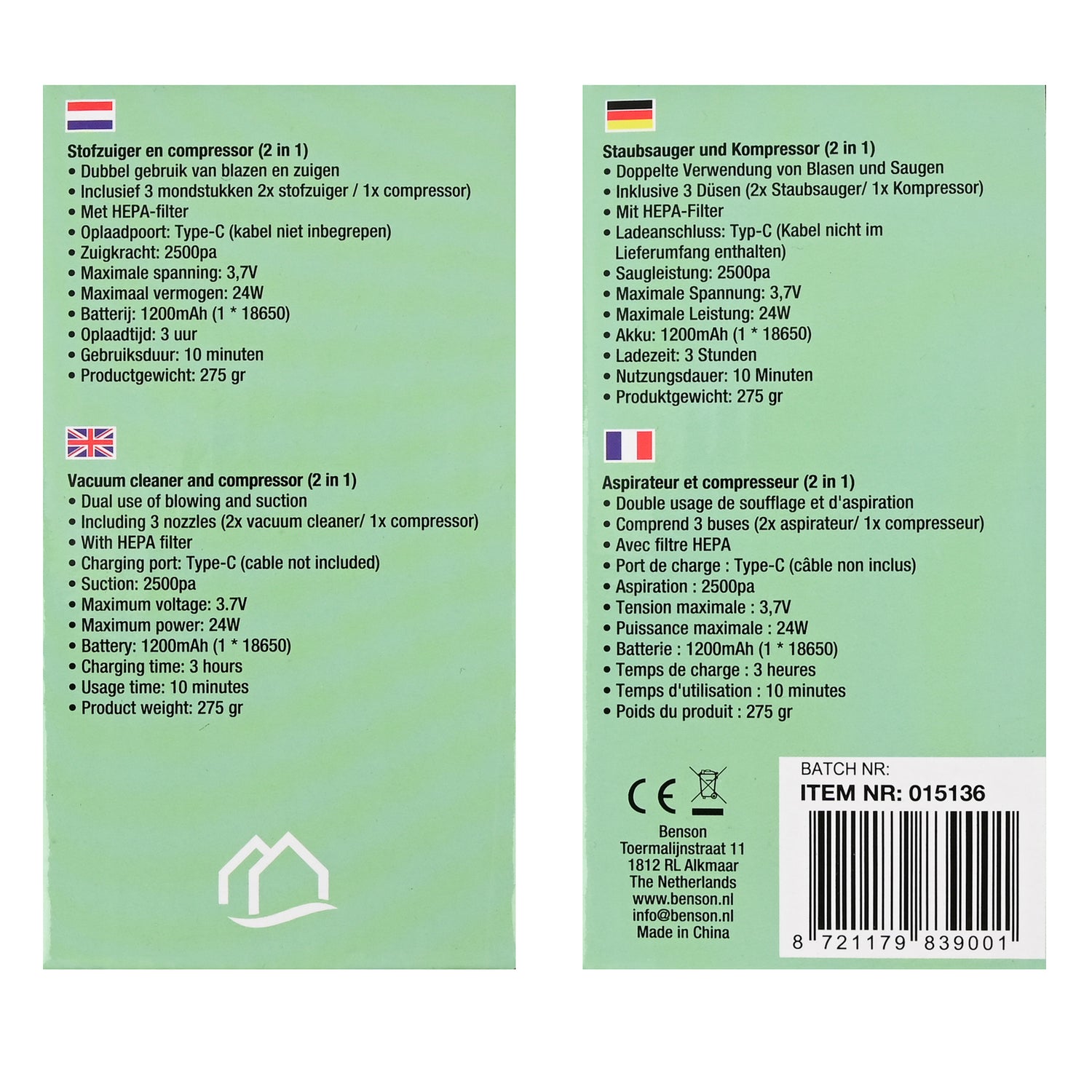 • Inclusief 3 mondstukken 2x stofzuiger / 1x compressor)