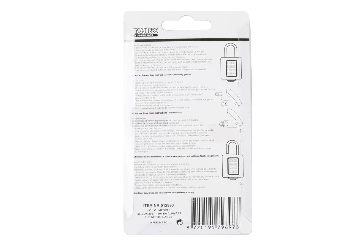Standaard is dit slot ingesteld op 0000 en is zeer makkelijk te wijzigen naar uw gewenste code