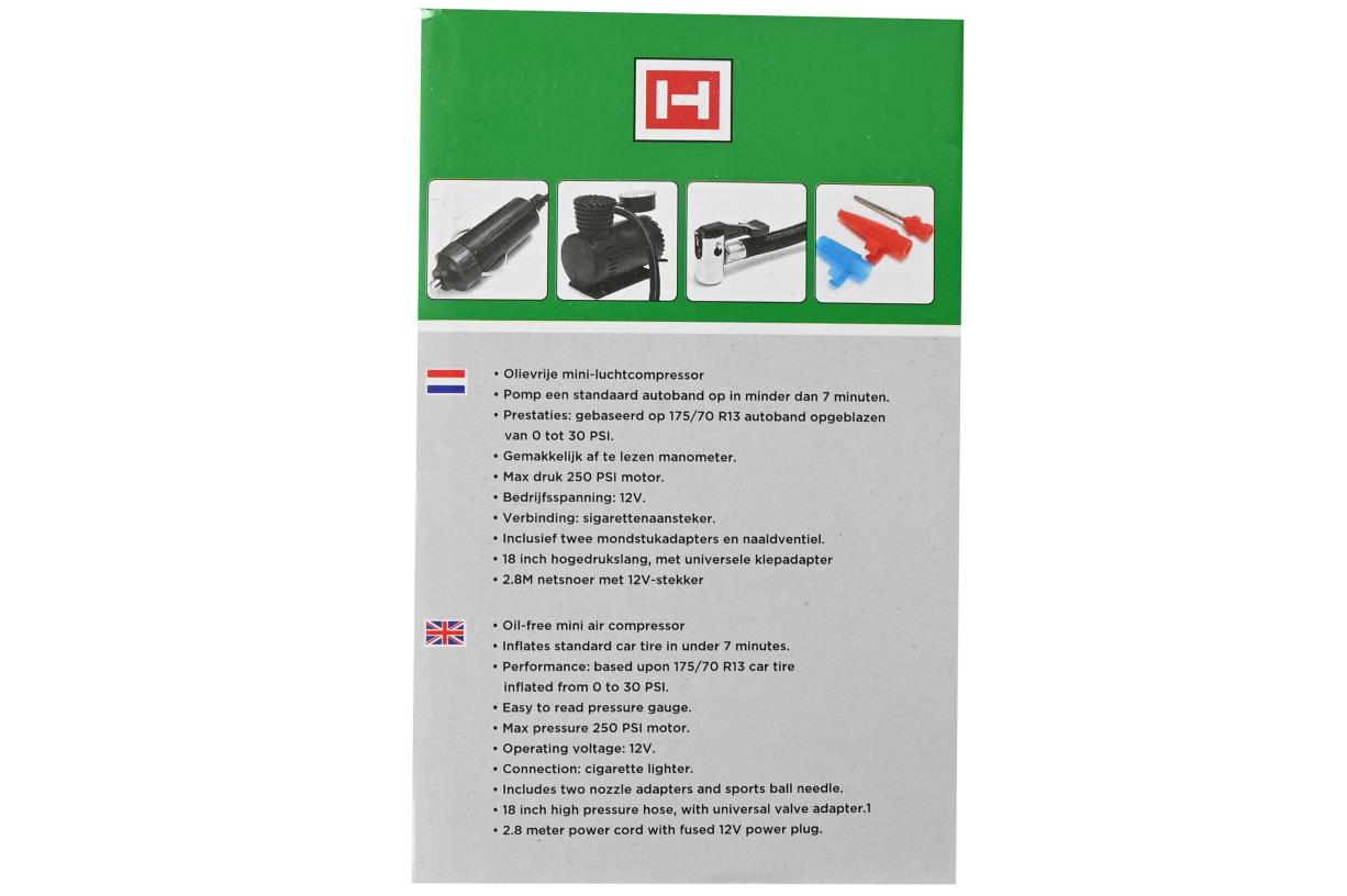 Je plugt de pomp gemakkelijk in de sigarettenaansluiting (12V) van je auto om de pomp in werking te stellen. De Air Compressor is ook voorzien van een luchtdrukmeter.