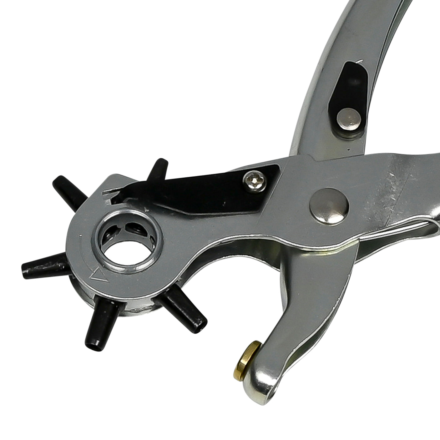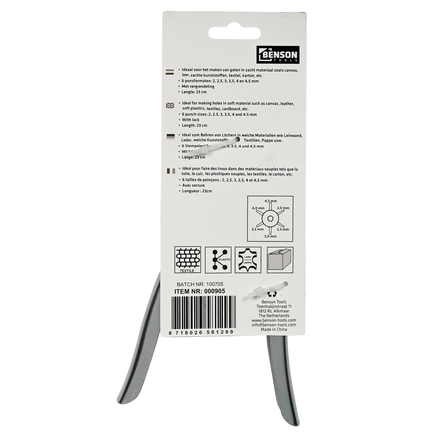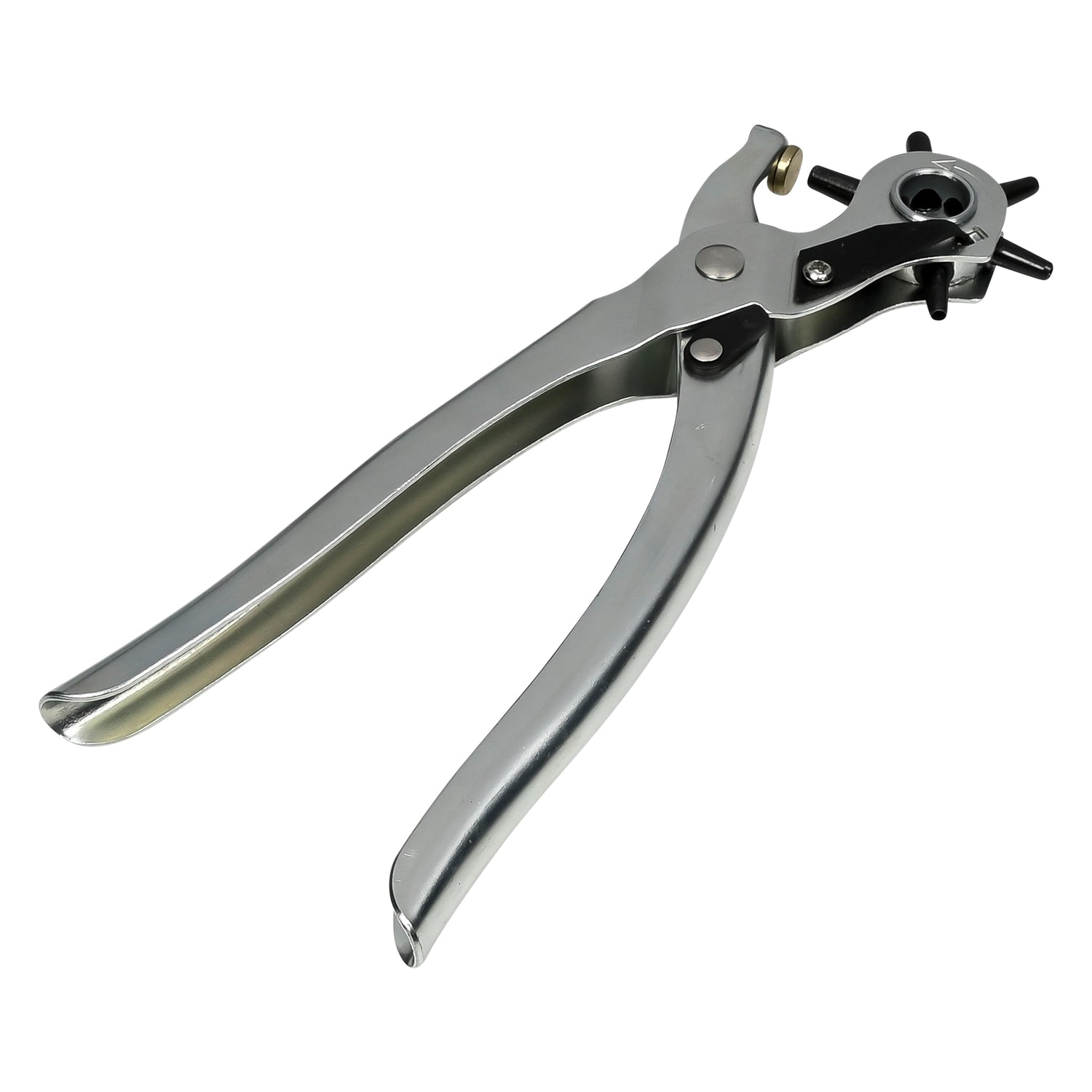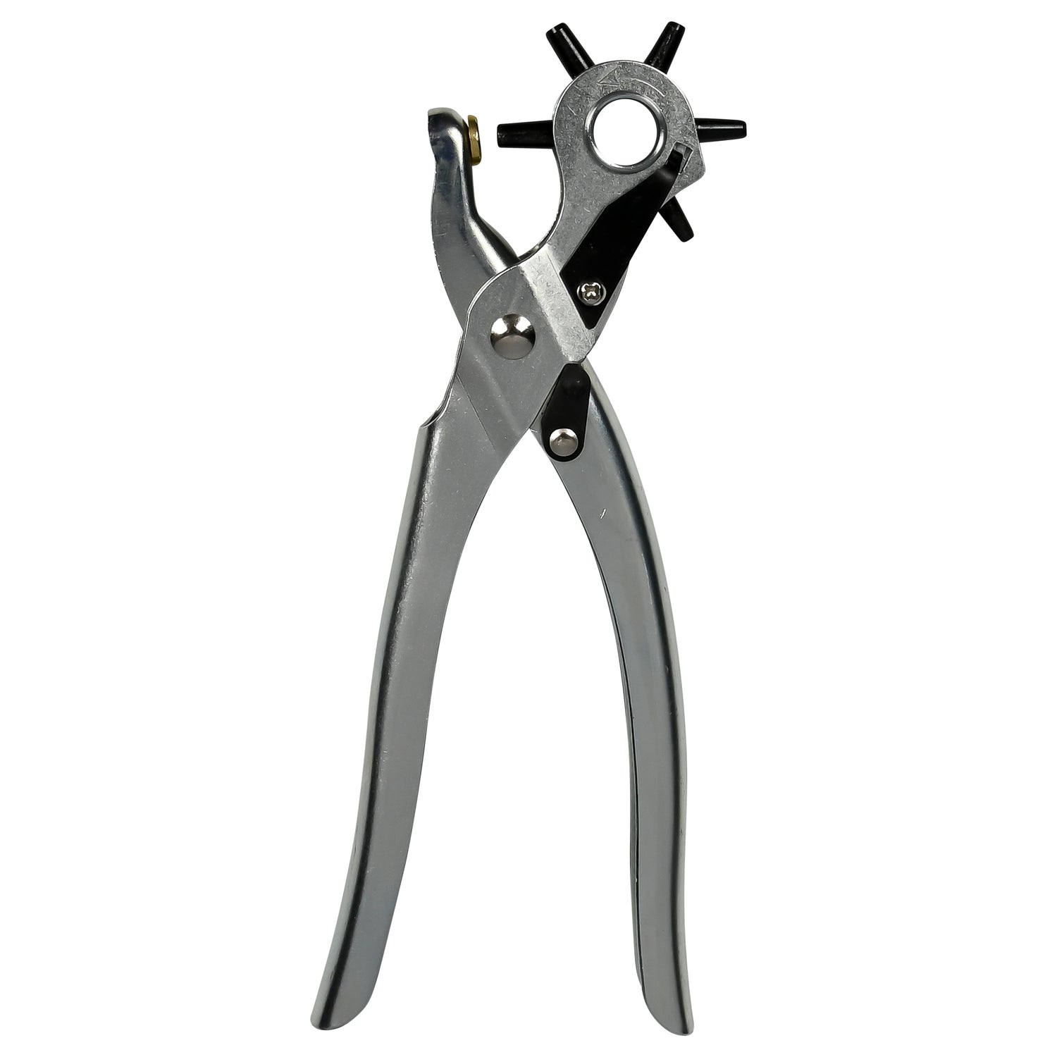 De revolvertang is een veelzijdig gereedschap voor het maken van gaten in zachte materialen zoals leer, canvas, textiel, karton en kunststof. Met zes verschillende ponsformaten (2, 2.5, 3, 3.5, 4 en 4.5 mm) biedt deze revolvertang flexibiliteit voor diverse toepassingen, van het aanpassen van riemen tot het maken van creatieve projecten.